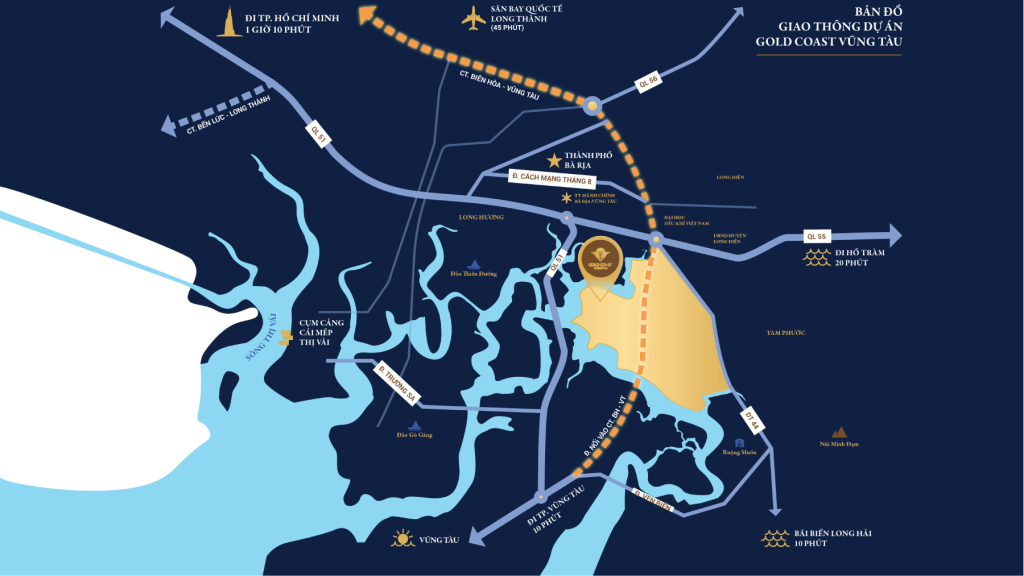 Dự án Gold Coast nằm ở phía Tây huyện Long Điền. Đây là vị trí cửa ngõ, tiếp giáp TP Bà Rịa, TP Vũng Tàu. Các chuyên gia BĐS đánh giá cao về vị trí của dự án khi sở hữu hệ thống giao thông huyết mạch, sầm uất.