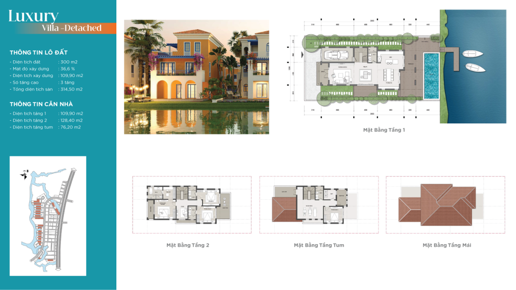 - Biệt thự đơn lập: Diện tích 300m2, gồm 2 tầng, 1 tum.
