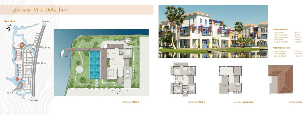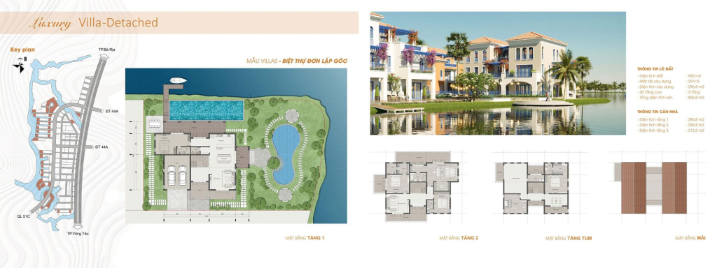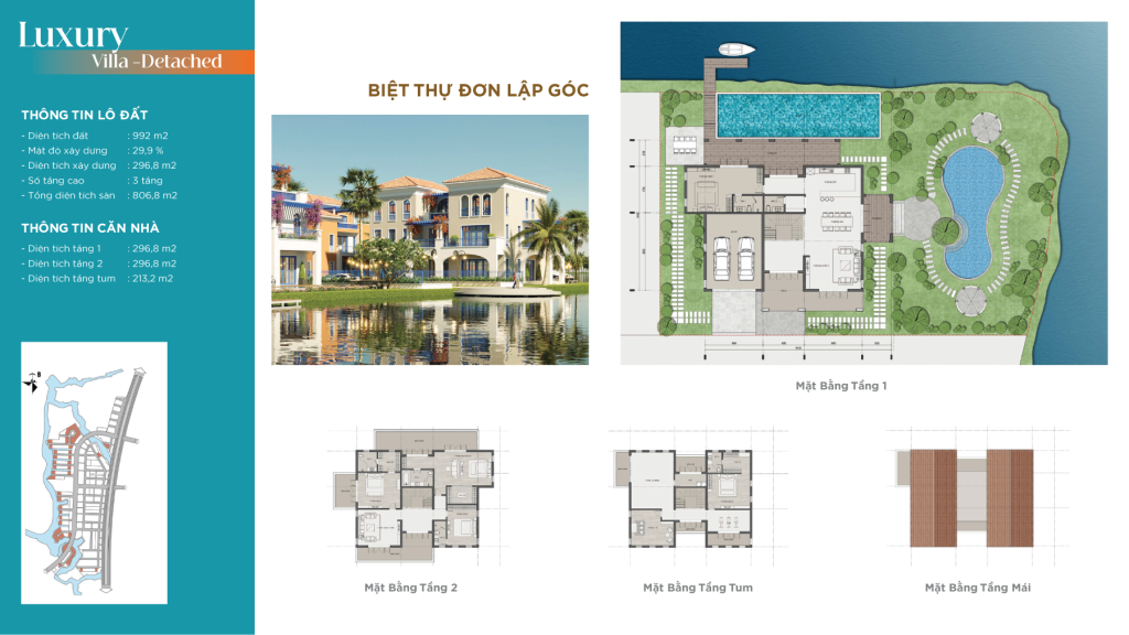 - Biệt thự đơn lập góc: Diện tích 992m2, gồm 3 tầng