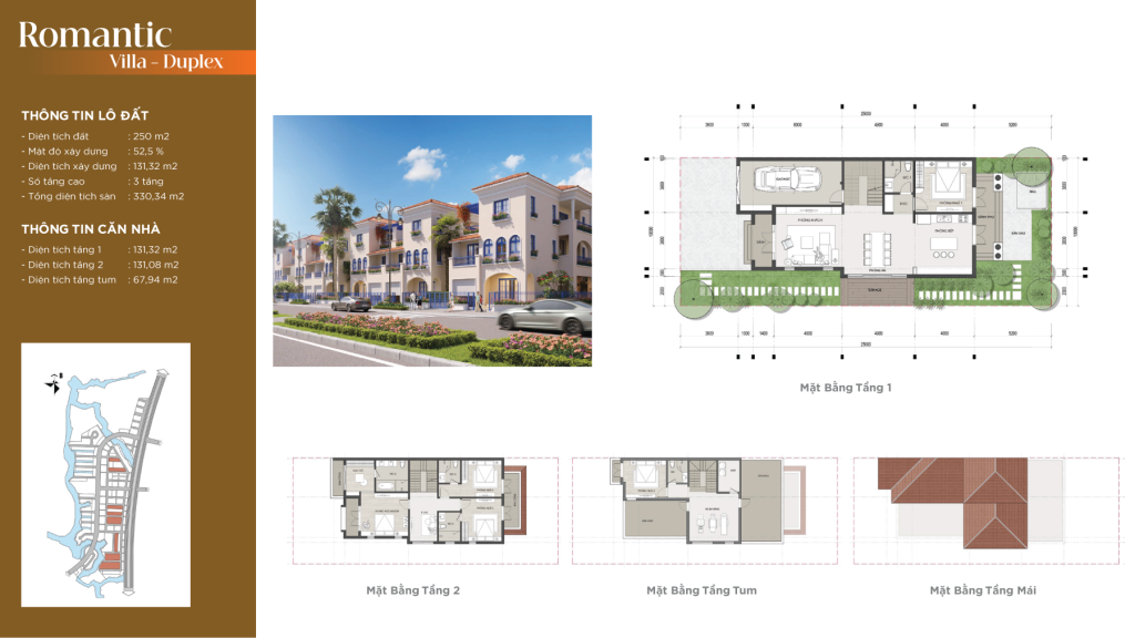 - Biệt thự song lập: Diện tích 250m2, gồm 3 tầng