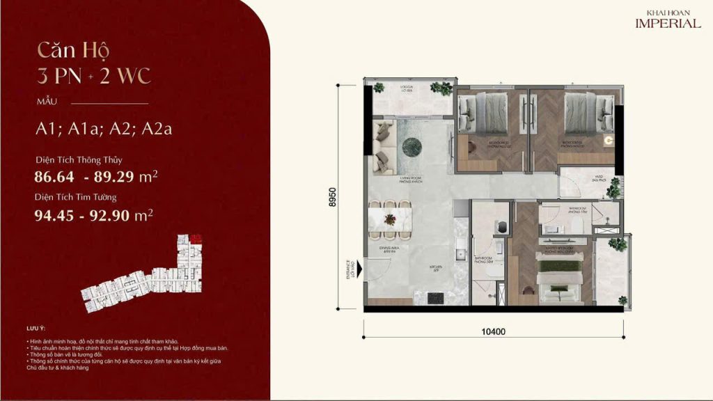 Mặt bằng Khải Hoàn Imperial Một trong những điểm nhấn nổi bật giúp Khải Hoàn Imperial Thuận An thu hút giới đầu tư và khách hàng chính là quy hoạch mặt bằng và thiết kế căn hộ thông minh. Với quy mô gần 2.000 sản phẩm trên diện tích 1,1 ha, dự án được chia thành 2 block cao 40 tầng, đảm bảo vừa tạo nên một quần thể hiện đại, vừa tối ưu công năng sử dụng cho từng căn hộ., cung ứng đa dạng các loại hình căn hộ, đa dạng diện tích như.